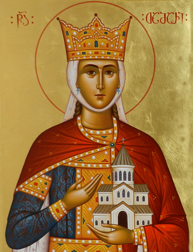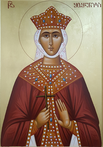 Icon of Saint Gabriel of Georgia, the Fool for Christ. Printed on a finished wood panel with gold paint detailing for the halos. Text in Georgian.