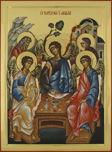 Icon of the Hospitality of Abraham. Printed on a finished wood panel with gold paint detailing for the halos.Text is in Greek