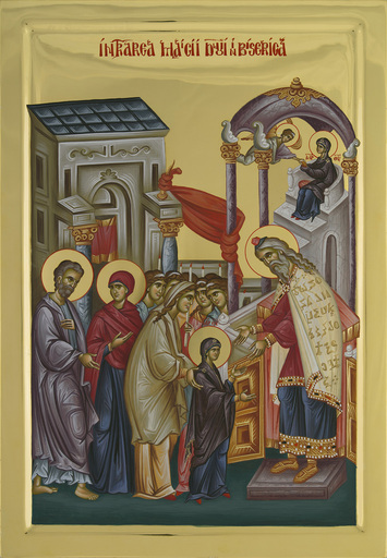 Icon of the Entrance of the Theotokos into the Temple. Printed on a finished wood panel with gold paint detailing for the halos.