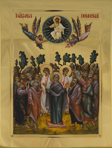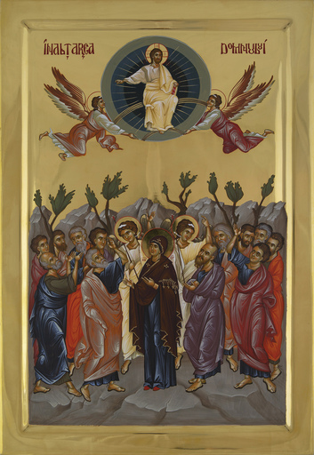 Icon of the Ascension of Our Lord Jesus Christ (Analipsis). Printed on a finished wood panel with gold paint detailing for the halos.