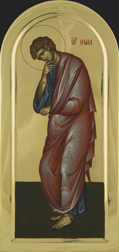 Icon of Saint John the Baptist (the Forerunner). Printed on a finished wood panel with gold paint detailing for the halos. Text in Romanian.