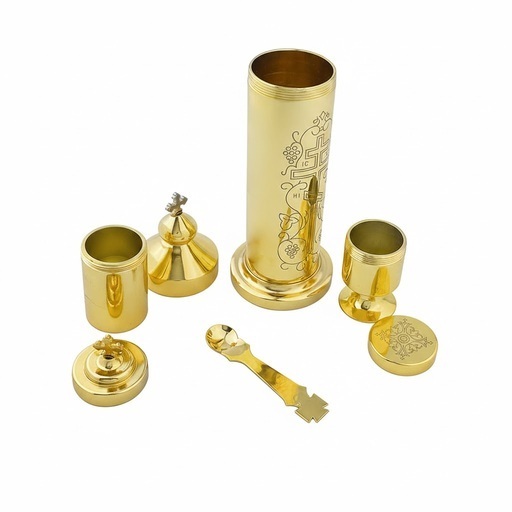Highly portable travel communion set for priests to administer Holy Communion outside the church building, especially when visiting the sick or homebound. The pyx and chalice fit perfectly inside the main cilinder and have screw-on lids to help prevent spills and protect the Holy Gifts during transport.