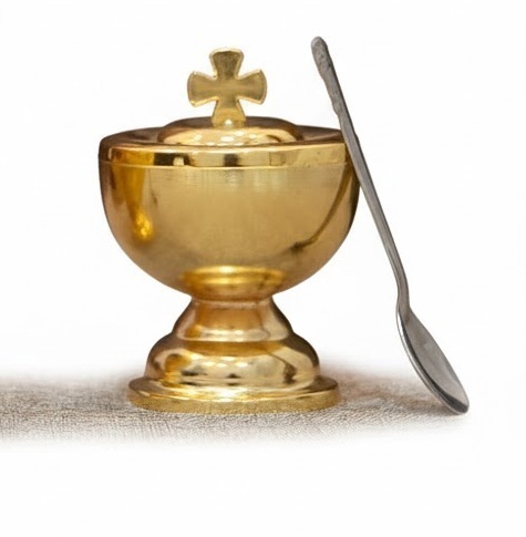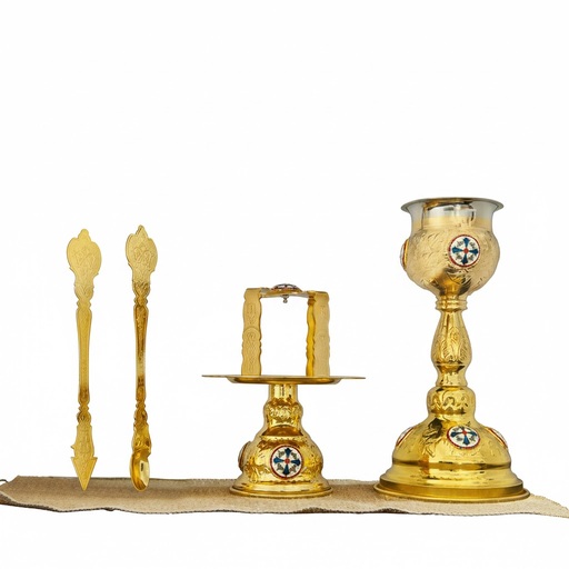 This liturgical Communion set contains the essential vessels used for the preparation and administration of the Holy Eucharist during the Divine Liturgy.