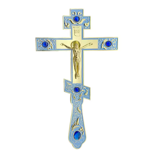 This elegant blessing cross features a refined gold-tone finish beautifully contrasted with soft sky-blue enamel accents. At the center, the cross features a depiction of the Crucifixion, crafted in metal and finished with gold-tone plating.
