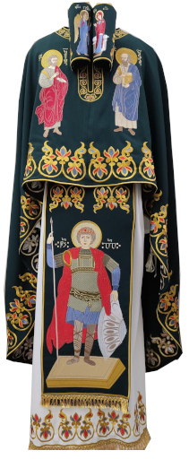 Dark green priest vestments richly adorned with embroidered icons and floral motifs in gold, blue, and red. On the front, the Phelonion features embroidered icons of St. Peter and St. Paul. An icon of our Lord Jesus Christ is embroidered on the back of the Phelonion. The Epimanikia are adorned with icons of the Annunciation. The Epistrachelion is embroidered with a large-scale depiction of Saint George the Victorious. Includes: Phelonion, Sticharion, Epistrachelion and Epimanikia.