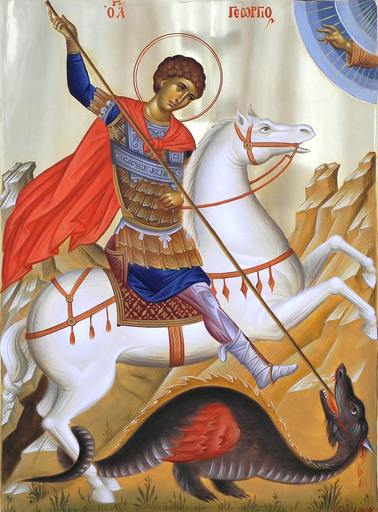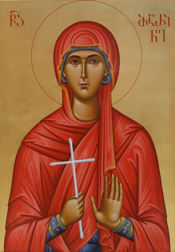 Icon of the Theotokos, Protectress and Defender of the Family. The icon depicts the Mother of God with Christ, accompanied by Saint Nicholas, Saint Andrew, Saint George, Saint Nino and the Holy Archangels Michael and Gabriel, all of them Saints traditionally associated with the protection of families and children. Printed on a finished wood panel with gold paint detailing for the halos. Text in Georgian.